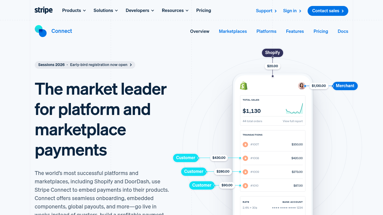 - Connected account model tailored for marketplace payouts with embedded onboarding components.